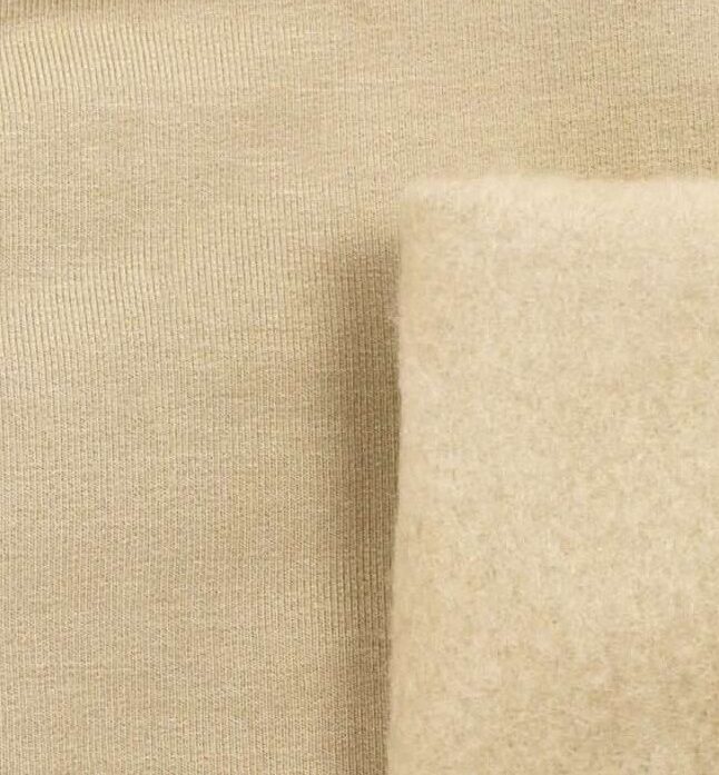 Bamboo Dream Fleece 60″ wide 66% Rayonne Bamboo/Rayon 27% cotton/7% Spandex: available in Cashew and Black.